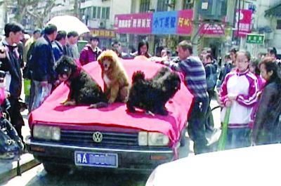 昨天中午12點,記者接到讀者報料趕到現場,發現長白街和大石壩街交叉路口早圍滿了看熱鬧的市民。一輛青海省西寧市牌照的紅色桑塔納停在路口,車頂上鋪了一層紅色布氈,7只小“藏獒”被一溜擺放在車頂上。4名男子操著不太地道的普通話,正在賣力地向路人作推銷。