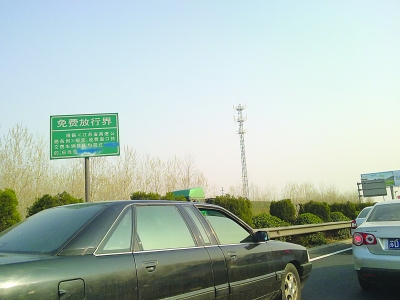 免費標識牌不知被誰抹掉了“200米”“免費放行”的字樣。記者昨日下午攝于潤揚大橋收費站前 資料圖片