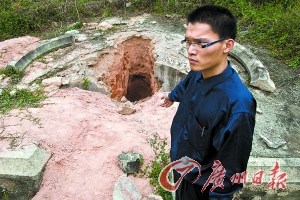 李先生站在被挖掘的祖墳前,很是痛心。 記者楊勤攝