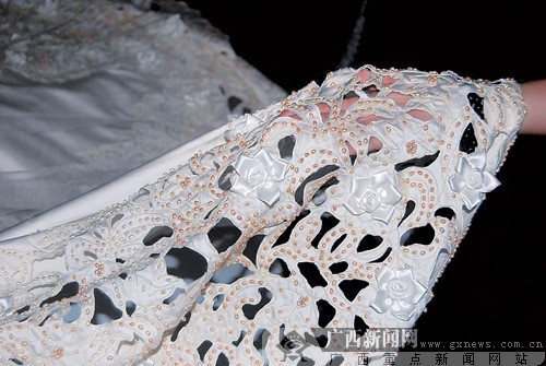 鑲嵌在婚紗上的珍珠。記者 許海鷗攝