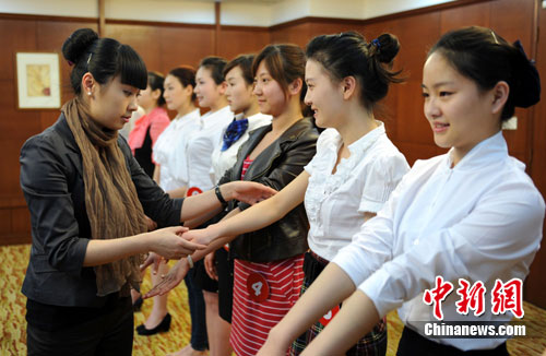 4月18日,重慶一空乘招聘現場,考官查看準“空姐”們的手臂。曹多然 攝