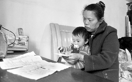 昨日,抱著揚(yáng)揚(yáng)的蹇女士望著桌子上的一堆欠條顯得無(wú)奈。蔣雨龍 攝