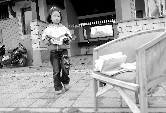 聊了一會兒,她下床拿起床下的小凳子和作業本,來到公廁外的人行道上。這里放著一張破損的舊椅子,海綿從紅色的坐墊下露了出來。小嘉雯收拾了椅子上的報紙,沒有發現那上面正登著她的照片。