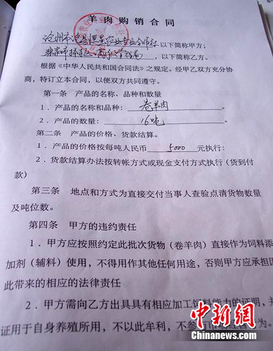 圖為張家口市橋東區工商管理提供的羊肉卷購銷合同。中新網發 譚地 攝