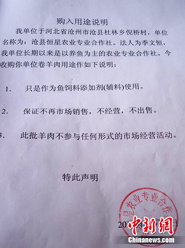 圖為滄縣恒興農業專業合作社簽署的《用途說明》,明確寫著:只做魚飼料添加劑(輔料)。中新網發 譚地 攝