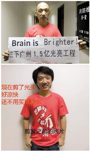 “征集光頭,照亮廣州”,27日凌晨1時(shí)許,一位網(wǎng)名“brainisbrighter”的廣州仔發(fā)表了一篇題為《征集廣州市民剪光頭照亮廣州,攔下1.5億光亮工程》的博文,同時(shí)貼出自己削發(fā)過(guò)程等照片,并在新浪微博轉(zhuǎn)發(fā),引來(lái)眾多網(wǎng)民熱議。