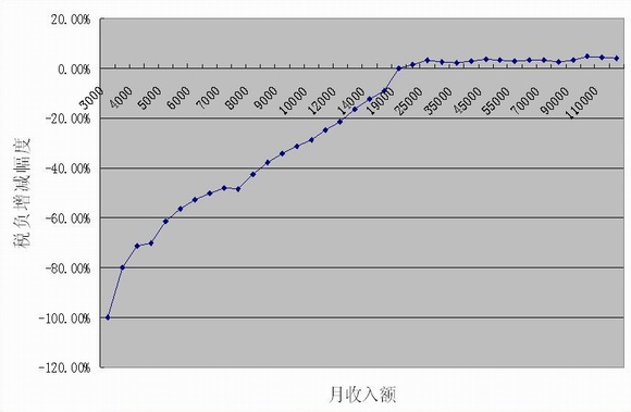 再考慮到草案將減除費用標準(即社會上所稱“起征點”)從2000元提高到3000元,不考慮可在稅前扣除的三險一金的情況下,各收入群體因個稅調整而發生的稅負變化如下表: