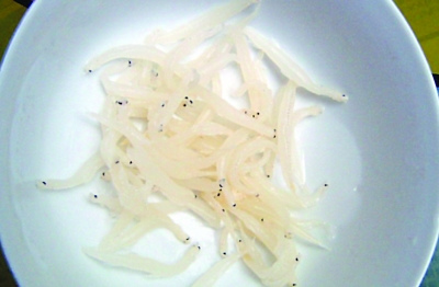 銷售者楊姓老板聲稱銀魚是從泰興農(nóng)貿(mào)市場(chǎng)進(jìn)的貨,泰興當(dāng)?shù)刭u的人很多,是不是真銀魚,他也不清楚,他的“上家”稱銀魚是用銀魚干“水發(fā)”而成,所以與新鮮銀魚有區(qū)別。檢查人員仔細(xì)辨認(rèn)發(fā)現(xiàn),這些銀魚頭部有小小的眼睛,但沒有內(nèi)臟和魚骨,有并不明顯的魚腥味,撈起后用手一捏,整個(gè)銀魚便碎了,類似于凝膠物質(zhì)。