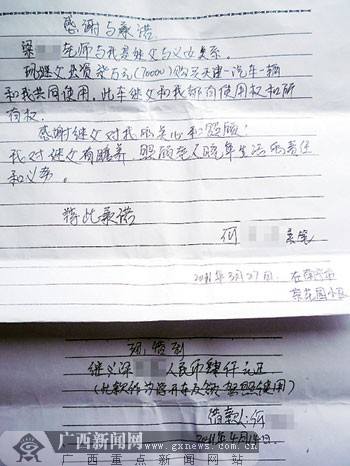 5月13日,南寧市茶花園小區大門的保衛室門口貼出一張告示,提醒每個值班的門衛:不經梁××先生本人同意,停放在小區內車牌號為桂ASQ8×5的小車不得放行。居住在該小區的梁先生說,這輛車是他經婚介所介紹認識的對象張某與女兒何某要求他出錢購買的。購車后不久張某提出分手,何某想把車開走,被梁先生及時扣下。梁先生說,認識后一個多月內,張某母女以種種借口索要錢物達7萬多元。但張某說,出現這樣的結果,其實自己也很委屈。