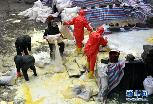 1月27日,在廣西柳州市柳城縣糯米灘水力發(fā)電廠,武警消防戰(zhàn)士將袋裝堿投入水池,準備引人江中稀釋污染水體。位于珠江上游的廣西龍江河段近日發(fā)生鎘超標污染事件,當?shù)丶跋掠窝匕冻鞘酗嬎踩馐車乐赝{。廣西各級黨委、政府迅速行動,一方面采取加大下泄流量、投放中和物、調(diào)水稀釋等方式努力降低鎘濃度;一方面及時發(fā)布相關信息,保障物資供應,緩解市民恐慌情緒,打響了一場針對重金屬鎘污染的“阻擊戰(zhàn)”。新華社記者 陸波岸 攝