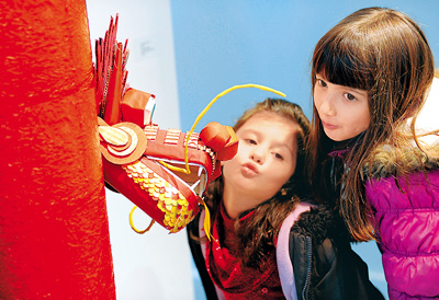 美國(guó)·華盛頓:華人居住集中的羅克維爾縣舉行慶祝中國(guó)農(nóng)歷新年活動(dòng)。6歲半的哈娜·弗蘭克(左)和7歲的勞倫·波維奇與一個(gè)中國(guó)龍的裝飾親密合影。 新華社記者 王軼歐攝