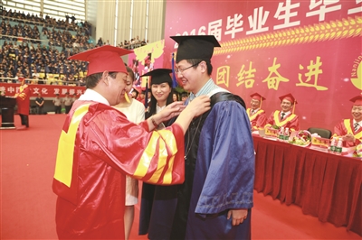 “哇!”“好羨慕!”“校長親自送戒指。 薄叭松A家!”……昨天上午,在南京中醫藥大學2016屆畢業生畢業典禮暨學位授予儀式上,3640名本科生、研究生、留學生濟濟一堂。當碩士研究生、一對學霸情侶蔣日磊和李倩走上臺之后,現場一陣轟動,南中醫校長胡剛為他們送上特別的禮物——一對刻有姓名、學號的戒指。