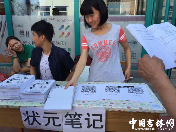 中國吉林網訊 記者 郭美佳 文/攝 中考第一日,在師大附中清華校區,吉林省理科高考裸分第一名劉默涵在考場外賣起了“狀元筆記”,排版精細,誠意滿滿,50元一本,受到很多家長的追捧。