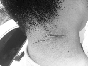 直到將關(guān)某完全控制后,曹彤焱才感到自己的后脖子有點疼,伸手一摸,一手血。同事迅速將傷口簡單處理后,立即將曹彤焱送往醫(yī)院包扎。經(jīng)檢查,曹彤焱后脖頸被刀劃傷兩處,共縫了十多針,而關(guān)某則毫發(fā)無損。