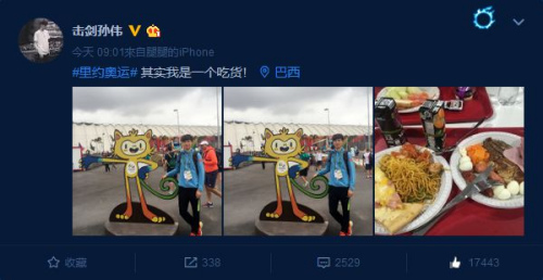 本屆奧運(yùn)會顏值頗高的中國男子擊劍隊(duì),憑借帥氣外表、出眾身材成為新晉網(wǎng)紅,男子佩劍運(yùn)動員孫偉的粉絲更是暴增。北京時(shí)間8日早上9點(diǎn),孫偉曬出自己在奧運(yùn)村餐廳的食物,并調(diào)侃“其實(shí)我是一個(gè)吃貨!”