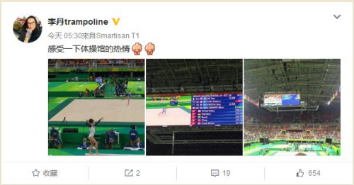 蹦床隊(duì)隊(duì)員李丹還在備戰(zhàn)中,她也在微博上曬出了訓(xùn)練的照片。為了盡早的適應(yīng)場地,李丹還專程到比賽場地“感受一下體操館熱情”。