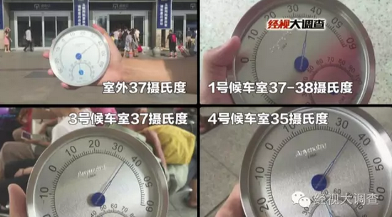 隨后記者又來(lái)到3號(hào)候車(chē)室。這里的溫度僅僅比室外溫度僅僅低了一度。4號(hào)候車(chē)室的室內(nèi)溫度是35°,與室外溫度也相差無(wú)幾。