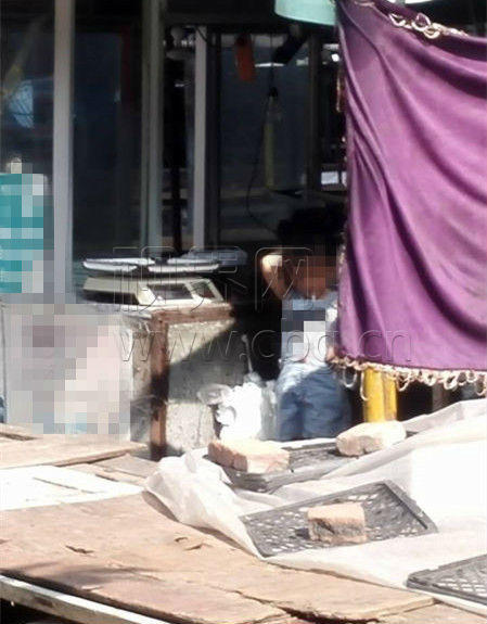 就在記者轉身正準備走開時候,記者發現小女孩又把藏在身后的香煙熟練的叼在嘴巴上,徑直走進了菜販的攤位里面,在里面繼續抽煙。