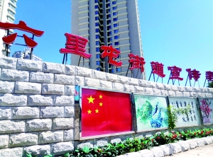 在姚家園路與甜水園街十字路口的東北角,記者昨日看到一堵墻上懸掛著“六里屯街道宣傳教育園地”字樣,張貼著幾幅關(guān)于精神文明等內(nèi)容的紙質(zhì)宣傳畫。排頭的是一幅五星紅旗,國旗上四顆小星星平行排列(如圖)。
