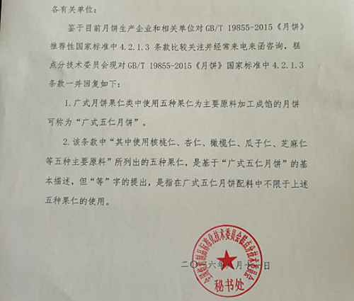 對此,全國焙烤制品標(biāo)準(zhǔn)化技術(shù)委員會糕點分技術(shù)委員會在函件中解釋稱,“等”字的提出,是指在廣式五仁月餅配料中不限于上述五種果仁的使用。