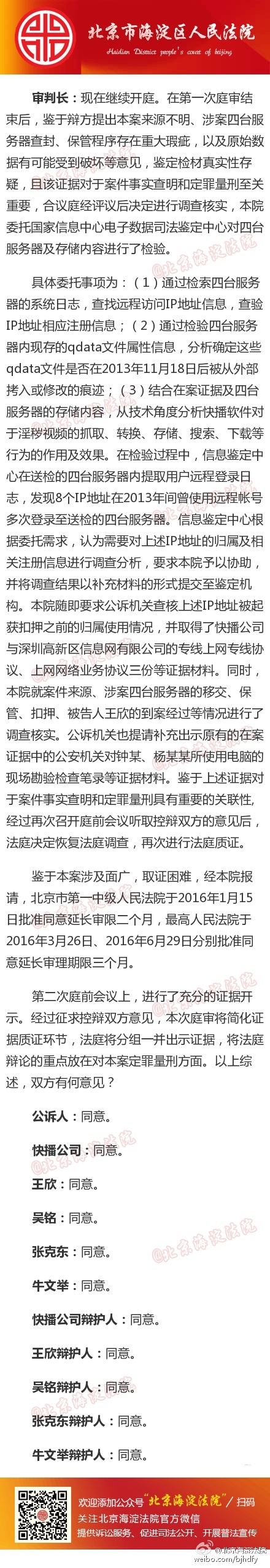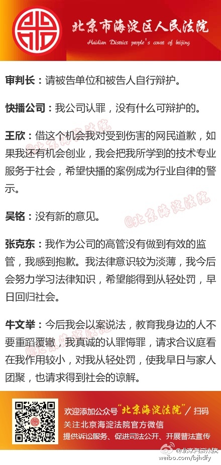 9月9日,北京市海淀區法院公開開庭審理深圳市快播科技有限公司,被告人王欣、吳銘、張克東、牛文舉涉嫌傳播淫穢物品牟利罪一案。根據北京海淀法院微博直播,快播及前CEO王欣均表示認罪,不辯護。