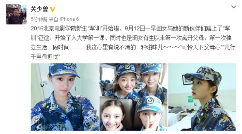 關(guān)少曾發(fā)文稱:“9月12日一早閨女與她的新伙伴們踏上了軍訓(xùn)征途、開始了入大學(xué)第一課”,他還感慨地說:“這是閨女有生以來第一次離開父母,第一次獨(dú)立生活。”并表示:“自己心里有說不清的一種滋味兒。可憐天下父母心,兒行千里母擔(dān)憂。”