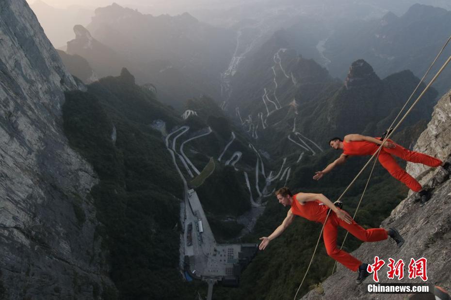 連日來,美國BANDALOOP高空舞團在湖南張家界天門山景區上演了一場場優雅而驚險的懸崖舞蹈秀,過往游客被深深吸引,驚嘆不已。此次表演以“翩躚云界、極限飛天”為藝術主題,舞者通過優雅而又驚險的舞姿,與鬼斧神工般自然奇景進行互動,闡述舞蹈與自然的關系,使舞蹈藝術盛放云端。9月13日,該舞團將在天門山的天門洞景點帶來正式演出。James adamson 攝