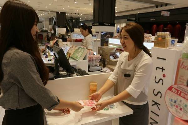 9月22日,在明洞一家化妝品商店使用人民幣購(gòu)物的中國(guó)游客。新華社記者姚琪琳攝