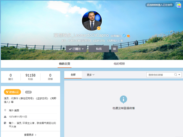 小李子的微博主頁空空如也,但不到三個小時,已經粉絲超過10萬。(截圖來自@萊昂納多_LeonardoDiCaprio微博)