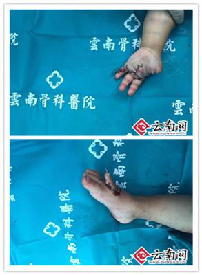 當晚6時,在確定了治療方案后,云南骨科醫院手足顯微科為小明明展開了一臺特殊手術。醫生為他毀傷的左手進行了清創,血管、神經、肌腱探查修復術,以及骨折固定術、試行手指再植術等,還對部分損傷的手指進行了寄養。從晚上6點到凌晨1點,經過7個小時的艱難作戰,醫生將小明明的三根指頭原位再植,成功地接上,而食指暫時“種”到腳背上,待它寄養成活且全身情況恢復良好后,再植入到手上。但遺憾的是,離斷的大拇指現在還無法接上。