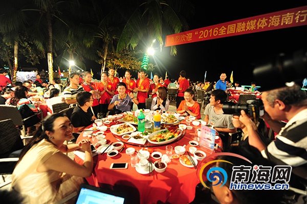 參加“全域旅游 海南范例——2016全國(guó)融媒體海南行”大型采訪活動(dòng)的52家全國(guó)融媒體記者在三亞?wèn)|海龍宮餐廳欣賞椰風(fēng)海韻,品嘗地道海南美食。南海網(wǎng)記者 沙曉峰 攝
