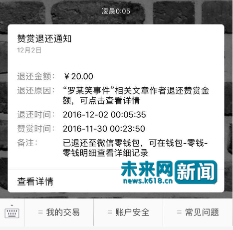 未來網北京12月2日電(記者 吳意茹)“我沒想到真的退款了,是作者良心發現還是迫于輿論壓力呢?”12月2日零點剛過,武漢的吳女士就收到了一條來自微信的退款提示:“羅某笑事件”相關文章作者退還贊賞金額!