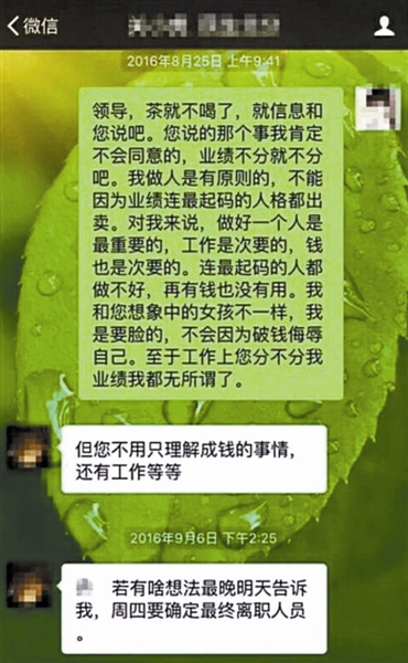 “周一早上在某某酒店喝茶可否?”“見面聊聊不會這么難吧?”“周四要確定最終離職人員……跟你說過,還有其他選擇,看你自己咋做了。”類似的騷擾消息,王琪(化名)已經從業務副總經理那里接收到很多次了。