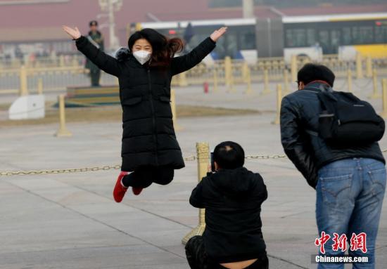 12月21日,北京持續霧霾。圖為游客在天安門廣場參觀。中新社記者 杜洋 攝