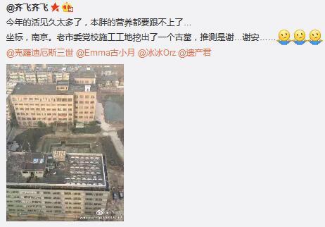 交匯點訊 12月22日下午17:17,一名叫齊飛齊飛的網友發的一條微博引起了很多人的關注,微博中寫到“坐標,南京。老市委黨校施工工地挖出了一個古墓,推測是謝…謝安……”這條微博在短時間內轉發過萬。