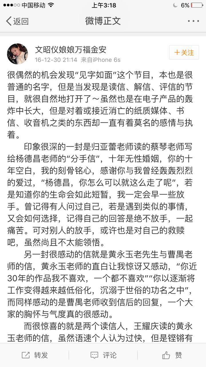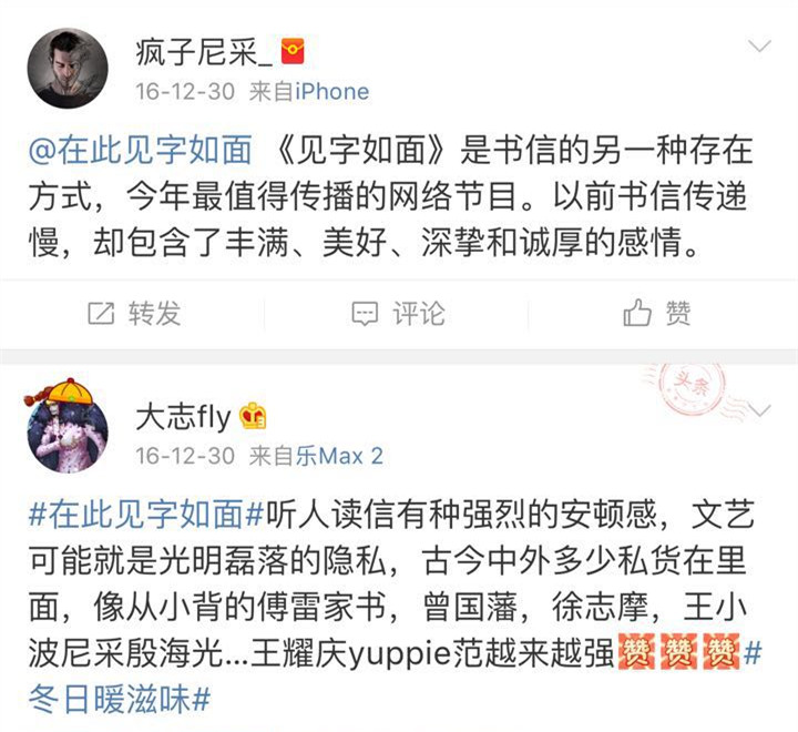 “有質(zhì)感”,“有內(nèi)涵”,“錘擊內(nèi)心”,“第一次看到這樣新穎的節(jié)目”,“絕對是2016年最后的驚喜”,“今年最值得傳播的節(jié)目”,“在2016年最好的、最有意義的一檔節(jié)目”……網(wǎng)友如此評價《見字如面》,并稱這是一檔能夠給人帶來靜謐的節(jié)目,“可以讓人思考、自修“,并讓人“突然覺得好像互聯(lián)網(wǎng)之外的中國是個不一樣的中國啊”。