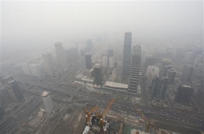 1月7日,北京中國尊,距離地面432米處俯瞰國貿區域被霧霾籠罩著。 新京報記者 王飛 攝
