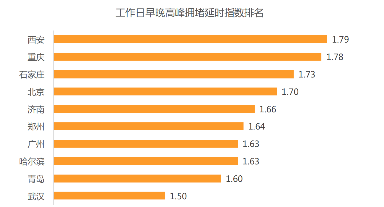 根據(jù)高峰期擁堵延時(shí)指數(shù),2016年,西安成為堵城冠軍,2015年的擁堵冠軍重慶,位列第2位,2015年的亞軍青島排名第9。北京雖然位列堵城第4名,因?yàn)椤吧鐣?huì)平均工資”較高,而成為因擁堵造成損失最高的城市,北京人每年損失8717元;在全國(guó)最堵的西安,人均擁堵成本為6960元,排名全國(guó)第3。