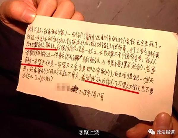 澎湃新聞看到,該紙條落款時(shí)間為2017年1月11日,當(dāng)事人稱這一生都不明白做人到底是求什么,沒有一技之長(zhǎng)也沒有賺到錢,自己沒用,打工時(shí)被騙,也沒有做過(guò)一件讓父母驕傲的事,總妄想一步登天。紙條內(nèi)容還稱,自己死后,希望父母不要太難過(guò)。不過(guò),該紙條內(nèi)容是否系死者本人生前所寫,目前尚未得到警方證實(shí)。