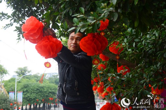 人民網(wǎng)恭城1月17日電 隨著春節(jié)臨近,廣西恭城瑤族自治縣在縣城的主要街道旁的大樹上陸續(xù)掛起吉祥如意的小燈籠,與干凈整潔的街道相得益彰,讓老百姓提早感受到濃濃的年味。