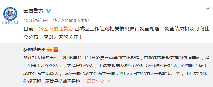中新網1月25日電 24日,有網友發微博稱2016年11月在麗江旅游期間,被一群陌生人暴打。云南省公安廳官方微博今日轉發該網友微博并回應,稱麗江市公安局已成立工作組對相關情況進行調查處理,調查結果將及時向社會公布。