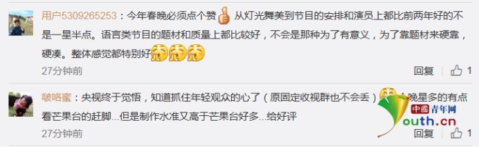 網友“小小萌兒V”留言:其實也還不錯 有幾個小品挺不錯的 閆學晶 沈騰 這兩個是最喜歡的 今年的歌舞感覺特別好?傊 各位春晚的工作人員辛苦了,新年快樂 ;而網友“誒嘿嘿DING”留言:今年春晚贊贊贊,舞美特效很棒,美女帥哥多(尤其帥哥養眼哈哈),小品相聲多(雖然有些比較尷尬,但總的來說質量還可以),而且有很多點能看出來特別用心,香港回歸20周年,航天英雄,中國傳統文化國粹戲曲,還有中國數不盡的大好山川江河。