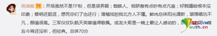對于整場春晚來講,也有網友發表了自己的看法。網友“桃瑞熊”表示:開場雖然不是TF粉,但是很養眼;蜘蛛人、我驕傲有點吵有點亢奮;好賤嘻哈根本沒印象;蔡明還挺逗,想死你們了也還行;滑稽戲恕我北方人不懂。鮮肉總體陽光清新,瑯琊唱功不凡,顏值很高。三軍儀仗隊航天英雄值得敬佩。成龍大哥是一晚上最讓人感動的,永遠的大哥!難忘今宵還沒聽,但經典?傮w70分。