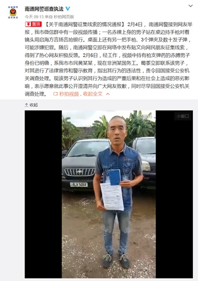隨后,南通網(wǎng)警立即在網(wǎng)絡中發(fā)布貼文向網(wǎng)民朋友征集線索,得到了熱心網(wǎng)友積極反饋。6日,經(jīng)工作,視頻中持有槍支彈藥的赤膊男子身份已明確,系南通市市民黃某某,現(xiàn)在非洲某國務工。警方立即聯(lián)系該男子,對其進行了法律宣傳和警示教育,指出其行為的違法性,責令回國接受公安機關調查處理。