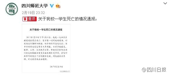 據(jù) @四川師范大學(xué)官方微博消息:2017年2月19日下午3點10分,一大四學(xué)生在寢室死亡。