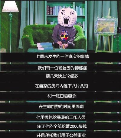 當(dāng)天晚上10點(diǎn),王尼瑪在節(jié)目中提到,上周末發(fā)生的一件真實(shí)的事情,一位粉絲男孩因?yàn)橐钟舭Y,前幾天晚上12點(diǎn)多,在自家的陽(yáng)臺(tái)上吞服了八片頭孢和一瓶白酒后意欲自殺。在生命倒數(shù)的時(shí)間里,這位男孩通過(guò)微信給暴漫的工作人員轉(zhuǎn)了他全部的積蓄2000元錢(qián),并拜托用于公益事業(yè)。