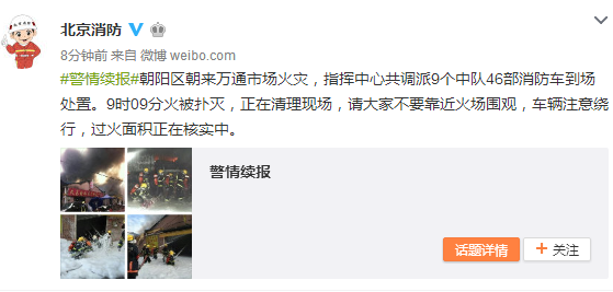 人民網北京2月27日電 據北京市公安局消防局官方微博消息,2月27日7時45分,119指揮中心接到報警,朝陽區朝來萬通市場發生火災,指揮中心立即調派6個中隊33部消防車到場處置。