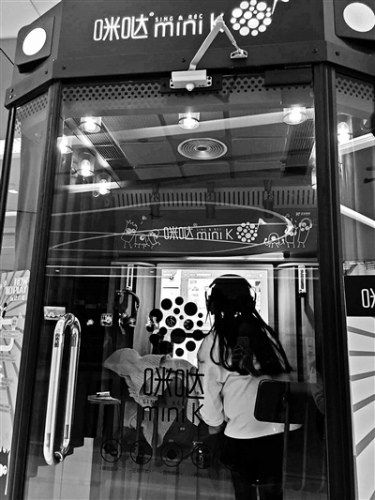 北青報記者來到朝陽區常營長楹商業街,商區四樓一餐廳旁擺放著兩臺標有“咪噠miniK”字樣的“玻璃房”,里面的人正在唱歌,一位中年女士帶著一個十多歲的小姑娘在外排隊等候,過往行人也不時投來匆匆一瞥。十多分鐘后,唱歌的人仍未出來,小姑娘在中年女士的勸說下離開了。北青報記者詢問旁邊餐廳的工作人員是否經常有人排隊等候唱歌。該名工作人員表示,偶爾有人排隊,但并不多,“里面的人一直不出來,外面的人等得不耐煩就走了!