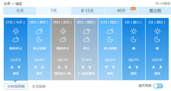 昨天開始,北京告別陰冷天氣,氣溫開始回升。北京市氣象臺(tái)預(yù)計(jì),未來三天仍將以晴到多云天氣為主,氣溫緩慢回升;不過28日夜間至29日白天擴(kuò)散條件略有轉(zhuǎn)差。