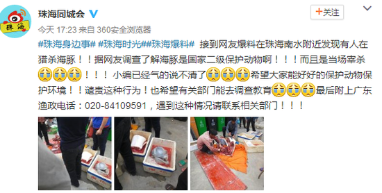 今天下午,@珠海同城會 發(fā)布微博稱,接到網友爆料在廣東省珠海市金灣區(qū)南水鎮(zhèn)附近發(fā)現(xiàn)有人在獵殺海豚,而且是當場宰殺。
